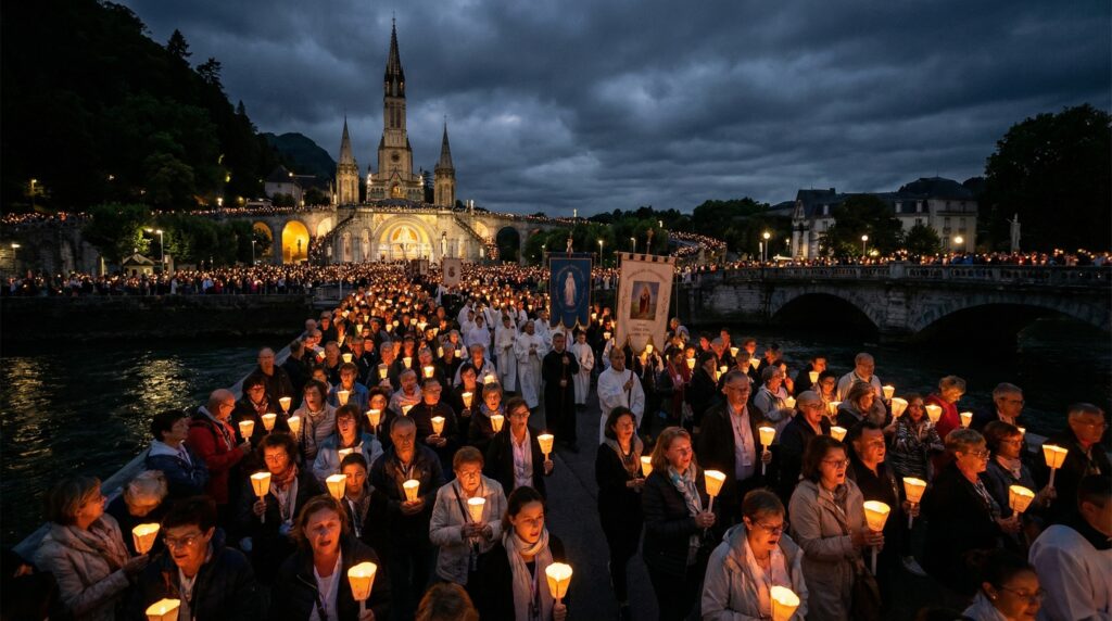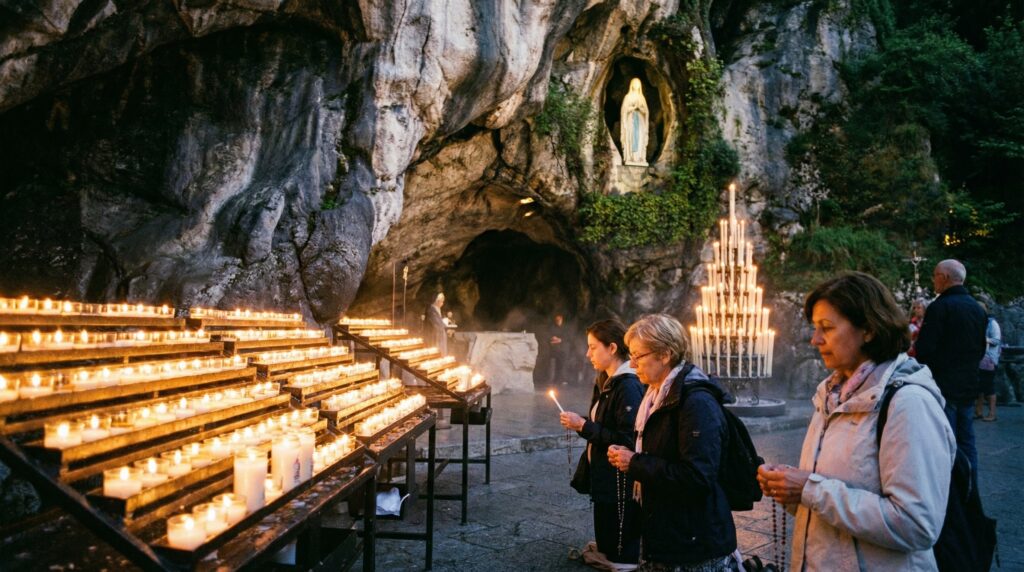 Chegada a Lourdes, visita inicial ao Santuário, Basílicas e Gruta de Massabielle, momento de acolhimento, oração pessoal e contato profundo com o ambiente de fé.